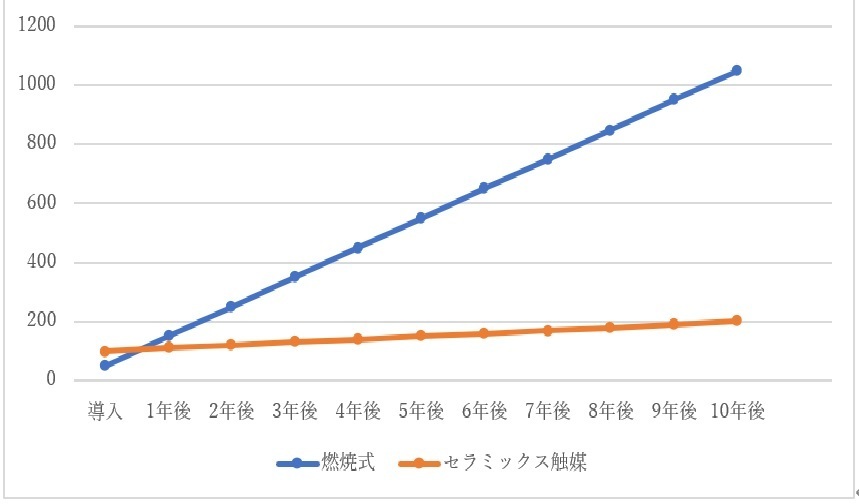 「あまり変わらない」と言うからには両者の金額差はもっと小さいと考えられますが、解りやすくするために切りのいい数字として燃焼式はセラミックス触媒の半額と仮定しました。